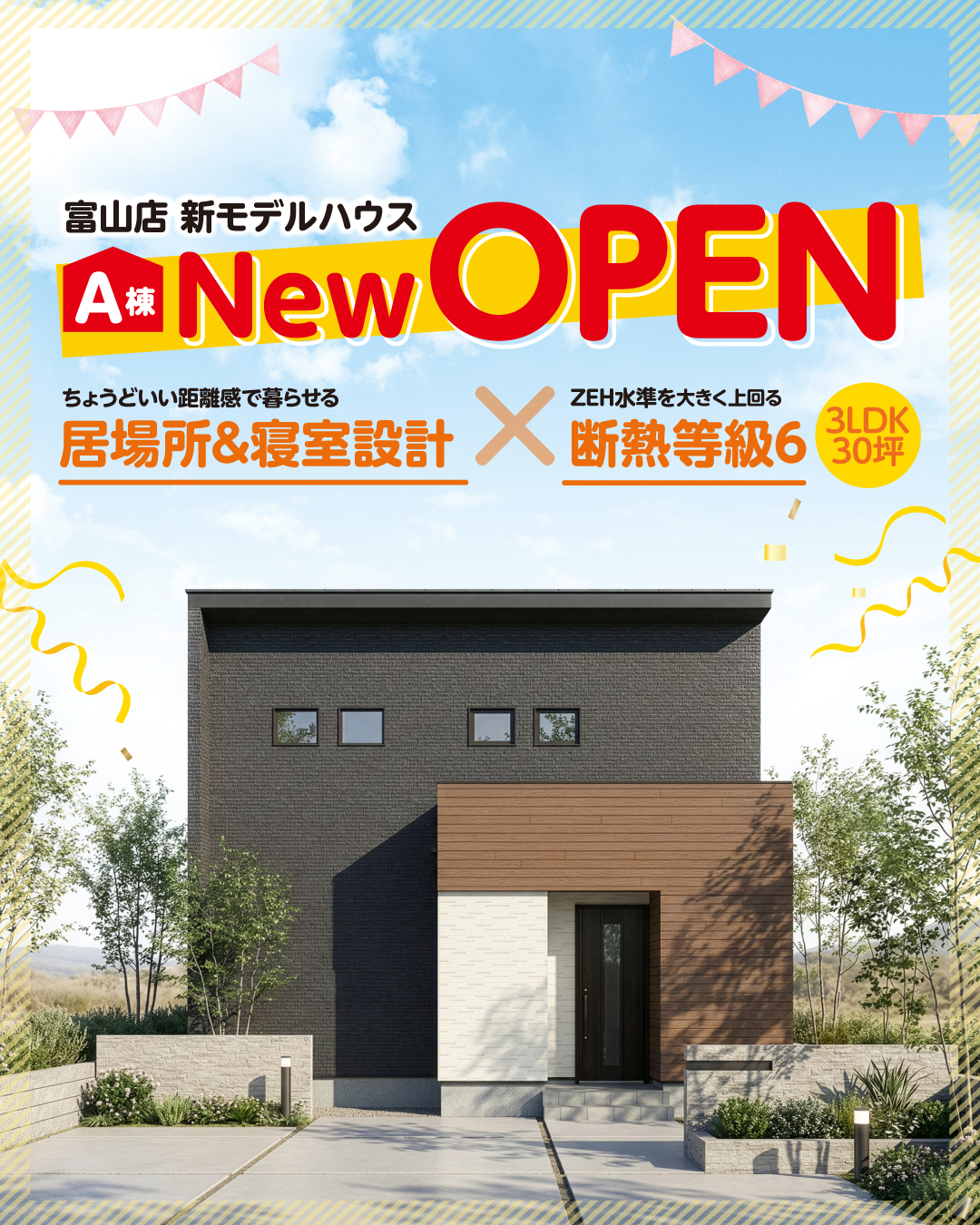 富山店 新モデルハウス誕生 富山店に新モデルハウスが誕生しました! 家族はそれぞれがくつろげる居場所を確保したLDKと、 生活リズムの違うご夫婦にも配慮した寝室プラン。 お互いの時間を大切にできる住まいです。 下記フォームよりご予約の上、ぜひご見学ください♪ マップコード:40 294 137*66